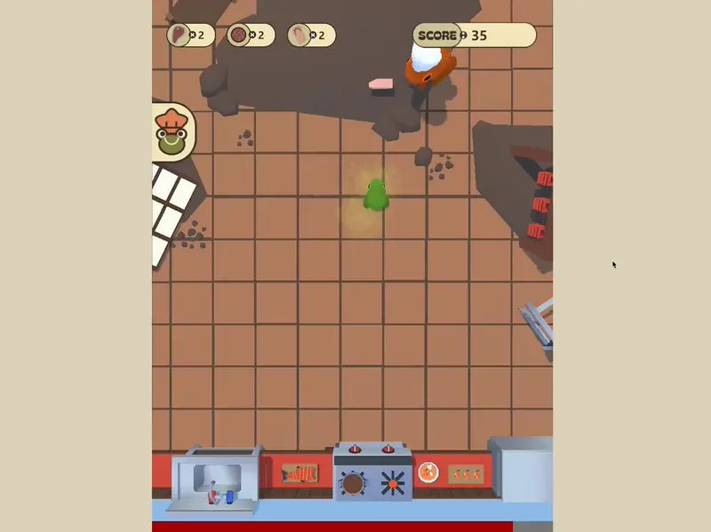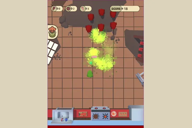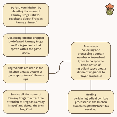 Mechanically, we stayed true to classic shmup roots, with enemies spawning in waves and power-ups that escalate the chaos. However, we reimagined the experience through the lens of a surreal kitchen battlefield, pitting Frogden Ramsay, an intergalactic culinary emperor, against us. We introduced a “cook-to-power-up” mechanic: between bursts of action, players must cook dishes to activate upgrades, such as increased fire rate or special damage types. This bridged moment-to-moment combat, with the player needing to find a good time to cook upgrades.